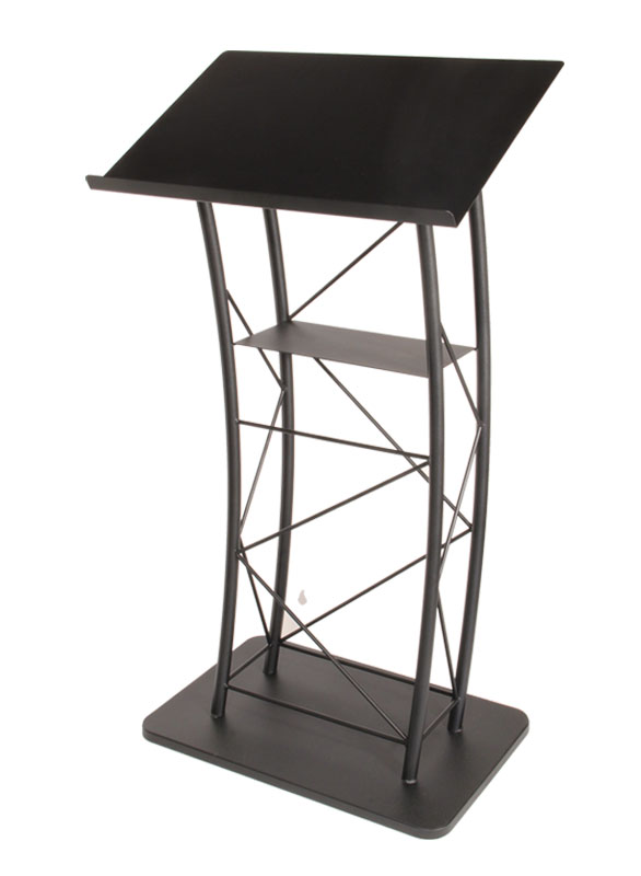 Modern style lectern is constructed from stainless steel. Top panel can easily accommodate a book or notes. Curved modern design will look great in your sanctuary, classroom, or meeting area. This lectern can be moved from room to room.